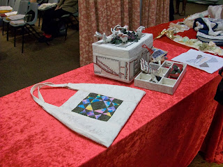The main excitement was created by las years 'Tie Back' Challenge. If you all remember, each branch was given three sets of tie backs and asked to produce something from them for this years meeting. Several branches rose to the challenge and there were some amazing results as the photographs below show. There were prizes given to the best individual entry and the best branch entry. Hillary from Yorkshire at Leeds Branch won the individual prize for her covered box and Airedale won the branch prize. Jackie made a wonderful patchwork bag, lap quilt and purse by mixing the tie back fabric with some of her own and then quilting it all. Although it didn't win, it did get several comments on the quality of the work.